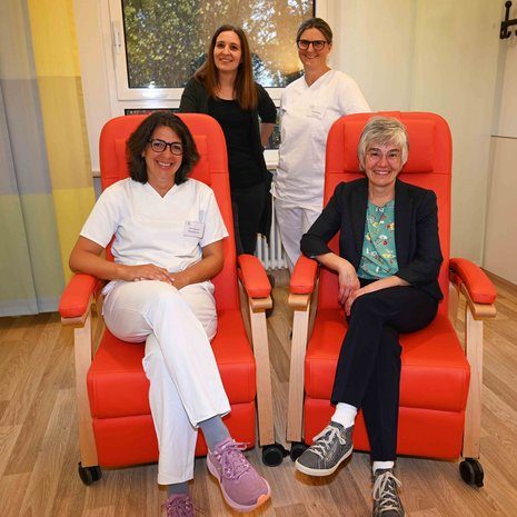 Besuch der Palliativstation der OSK Wangen durch Vorsitzende Dr. Heike Ostler-Kaps und stellvertretende Vorsitzende Christine Bareth. Die Leitung Ulrike Ahner und die stellvertretende Leitung Karina Bucher stellten die eingetroffenen Mobilisationssessel vor. Diese Sessel konnten durch die Spende von 3.000 Euro des Fördervereins finanziert werden. Der Förderverein bot erstmals seine Hilfe an, der Bedarf in Wangen war vorhanden. Vier der acht Patientenzimmer verfügten bislang nicht über Pflegesessel; die neuen multifunktionalen Sessel sind verstellbar und ermöglichen Sitzen sowie Liegen, wodurch Patienten und Angehörige sich besser entspannen können.